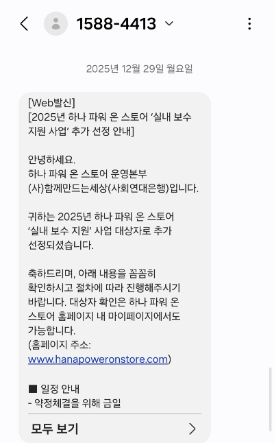 저는 1차 지원 사업인 고효율 에너지 기기사업에 지원 후 탈락해서 2차로 실내보수 지원 사업에 지원했으나 탈락해서 포기하고 있었는 데 2025년 12월 29일 에 추가 대상 자로 선정 되었다는 문자를 받아서 뛸 듯이 기뻐했답니다.
